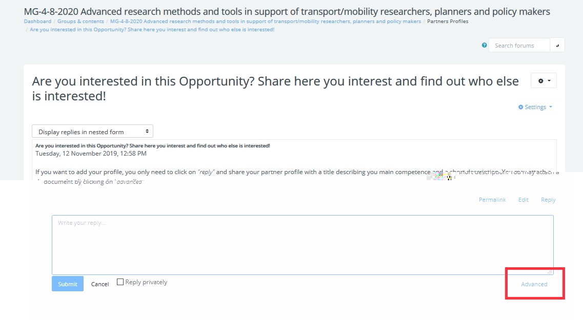As an example, we will take the topic “MG-4-8-2020 Advanced research methods and tools in support of transport/mobility researchers, planners and policy makers”. Once you are in this content area: Link (you need to log in and enroll), you need to click on: Are you interested in this opportunity, share here your interest and find out who else is interested. (see the picture 1 below). Then click on “Reply” (Picture 2 below) and a new screen will be prompted so you can include your partner profile. We recommend you share briefly your main interest and competence you would like to bring to a consortium. We encourage you to provide further information by clicking on “Advanced” (see picture 3 below) so you can include more structured information and attachments. In picture 4 you can see the interface. We recommend that as subject, you include the main title and aspect/key experience or the competence from you to contribute to this topic and/or your company name. Include in message a very short summary 2-3 lines so other users can know a bit more of your value proposition/competence for this topic. In attachment, you can drag and drop the document you shared. You may also include tags describing the competence so your profile may appear when users are navigating through the tag cloud in the dashboard.